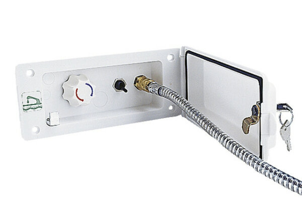 Supply flap for hot water with pre-mixer, water plug-in coupling, switch and shower fitting. Lock is not included, optionally available.